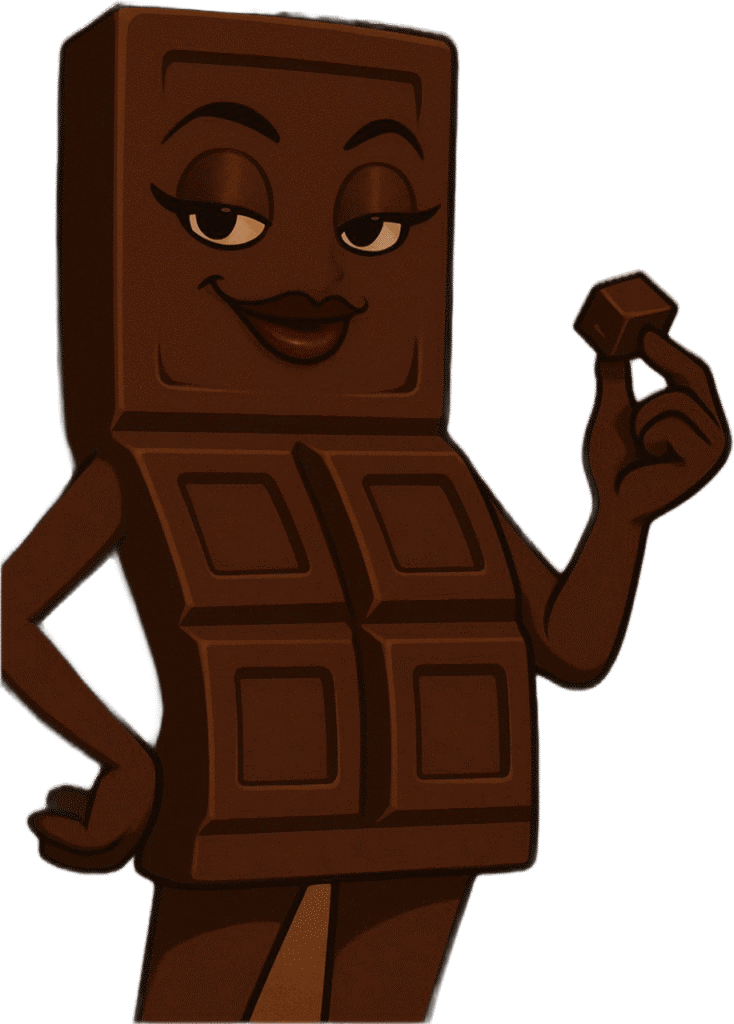 شخصية محبوبة، تحمل قطعة من الشوكولاتة الداكنة .