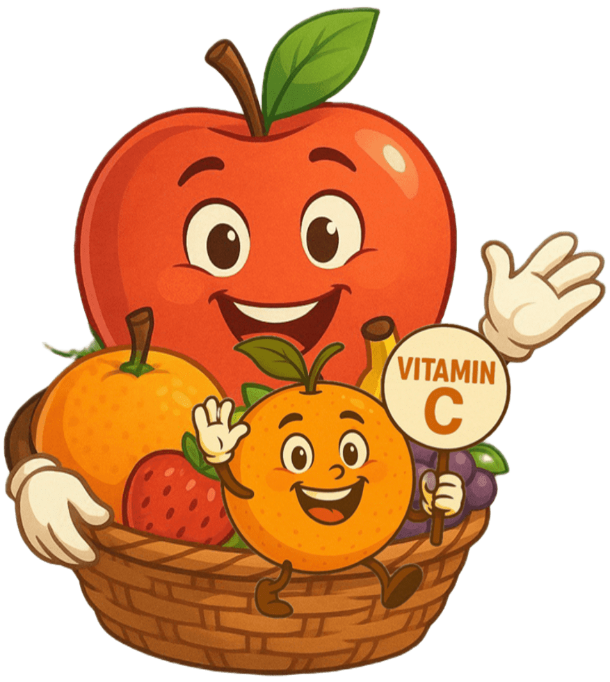 شخصية مرحة، تحمل سلة من الفواكه الطازجة .